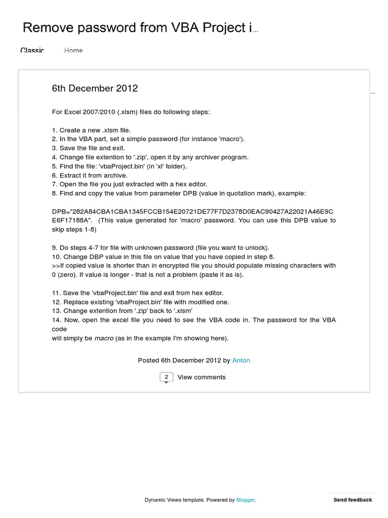 Jun 08, 2021 · step 4: Also, disable the lock project for viewing box and enable it again. Sep 05, 2014 · open the vba editor ( alt + f11) and press ok whenever the following warning pops up: At this point you can remove the password completely if … From these many ways, there are major 2 ways of breaking the ms excel password both for the workbook only and the vba project: Now, hold down the alt + f11 buttons. On the protection tab, set a new password. Enter a suitable password and confirm it. Oct 22, 2021 · how to unprotect vba project in excel without password: Within the macro window, you should not expand the project. Then, in the general window, enter the following code >> press f5. Then, press alt+f11 and verify or open visual basic editor. Aug 29, 2003 · well, actually you can unprotect a vba project with code, assuming you know the password (and still possible if you don't with some password cracking software out there).